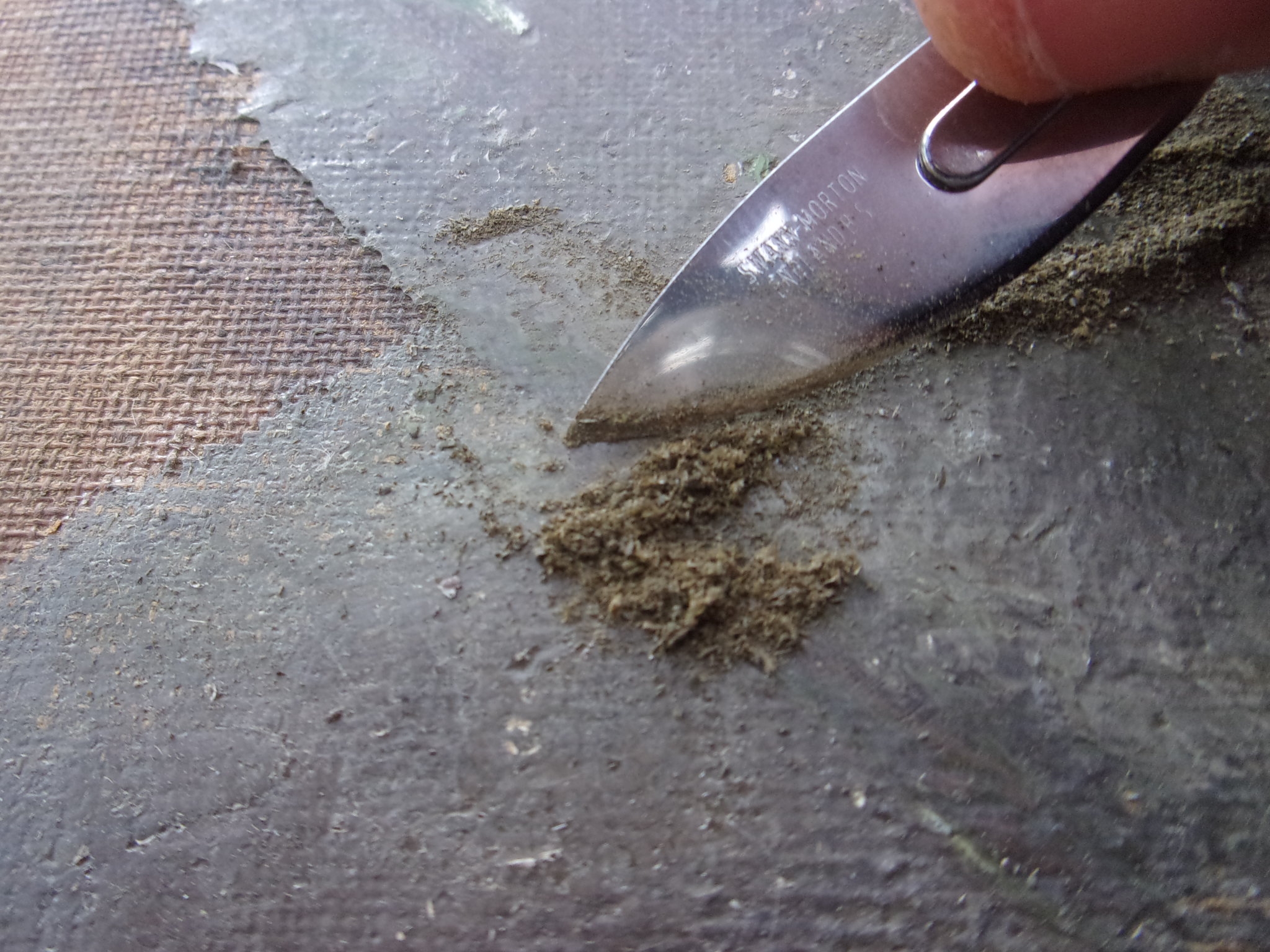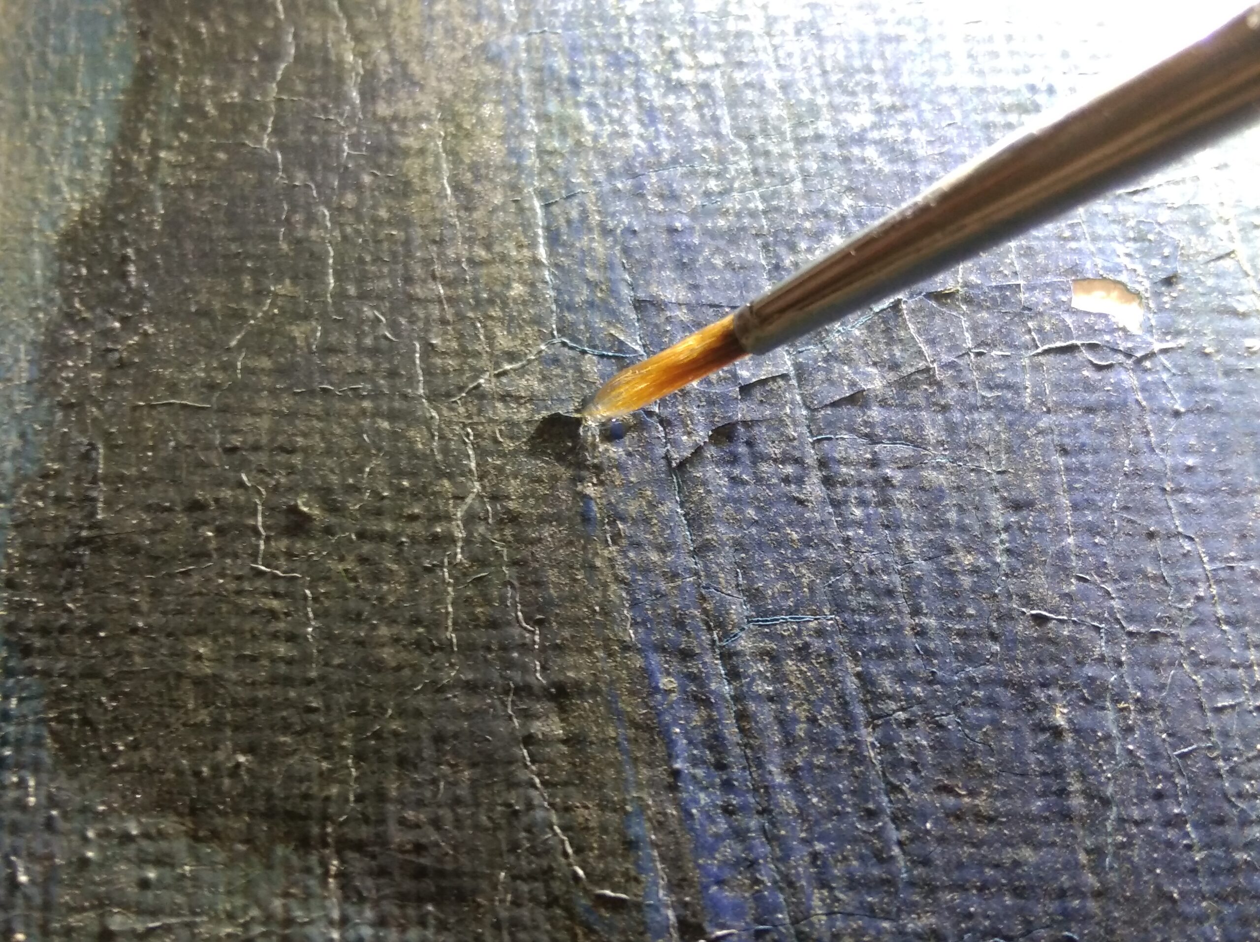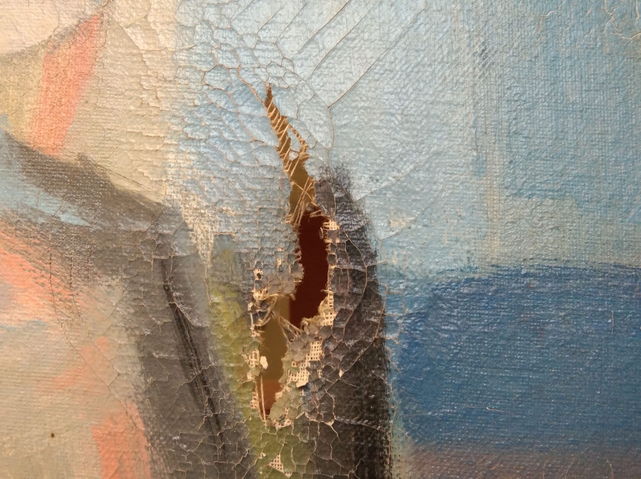 Dérestauration : désentoilage, retrait de pièces et de mastics anciens.